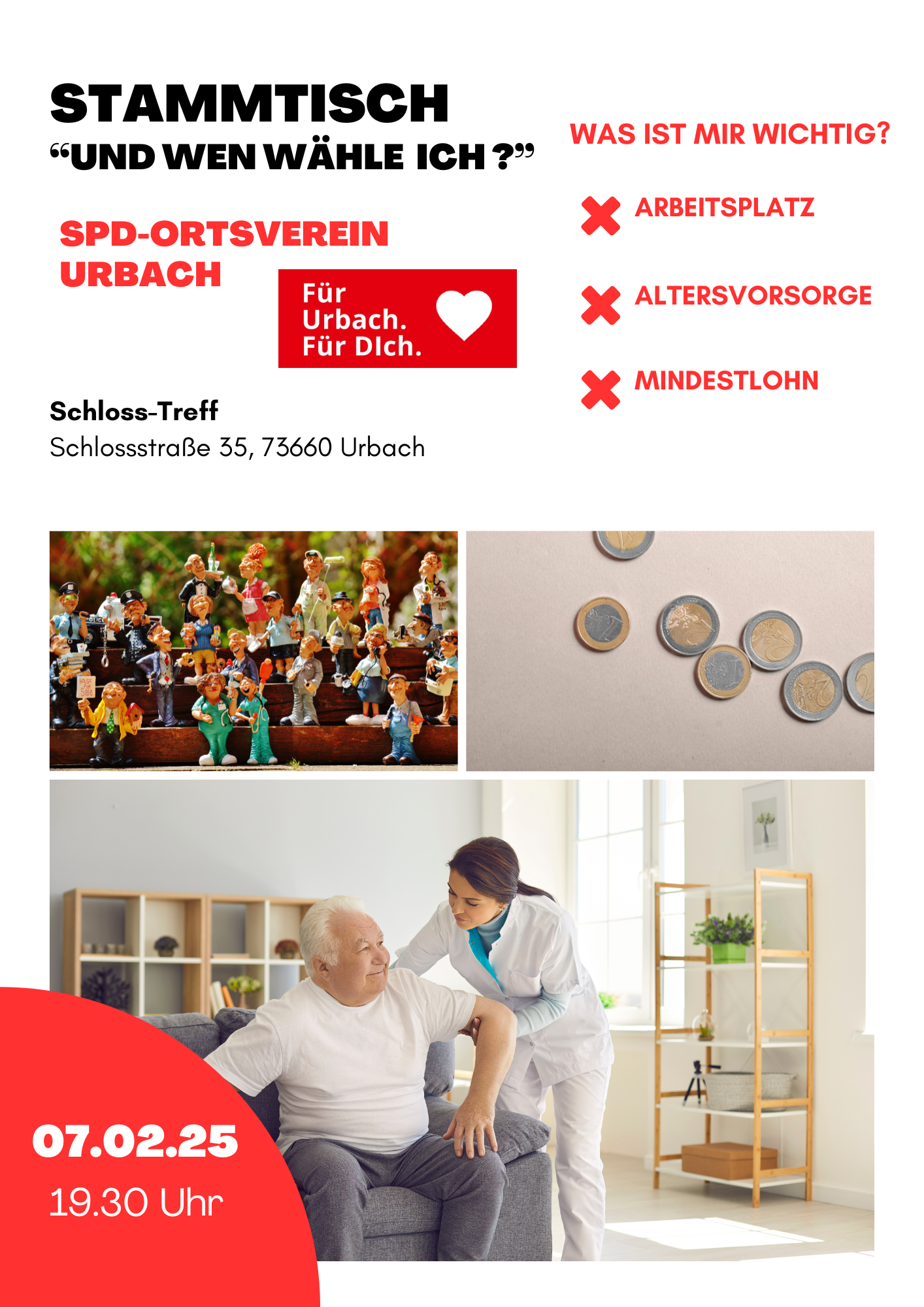 Wir möchten euch ganz herzlich zu unserem nächsten SPD-Stammtisch am 07.02.2025 ab 19.30 Uhr in den Schloss-Treff, Schlossstraße 35, hier in Urbach einladen.